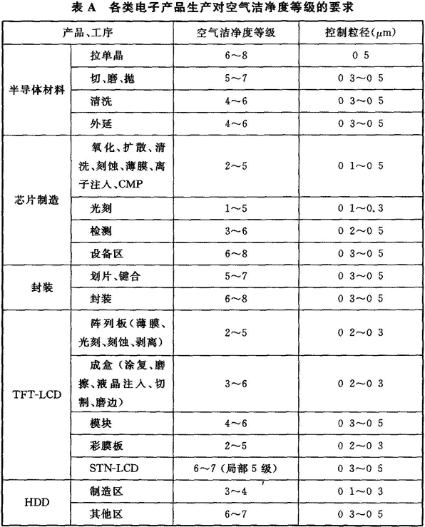附錄A 各類(lèi)電子產(chǎn)品生產(chǎn)對空氣潔凈度等級的要求