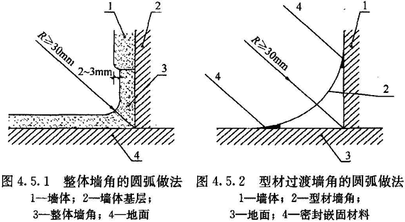 4.5.1 地面與墻面的夾角應為曲率半徑只不小于30mm的圓角。當用柔性材料粘貼地面時(shí),在墻面上應延伸至地面以上形成圓角并與墻面平齊,或略縮進(jìn)2mm~3mm,突出的墻面應圓滑過(guò)渡(圖4.5.1)。需經(jīng)常沖刷的地面,地面材料在墻面上延伸高度應大于150mm。