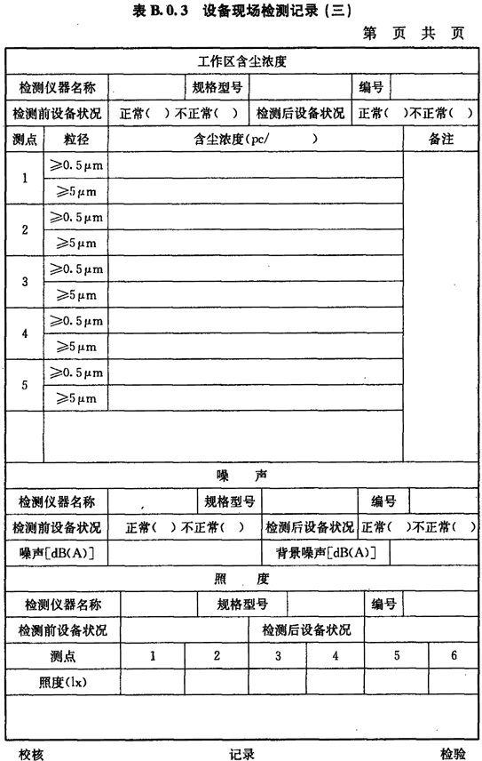 B.0.3 工作區含塵濃度、噪聲、照度的檢測應按表B.0.3進(jìn)行記錄。