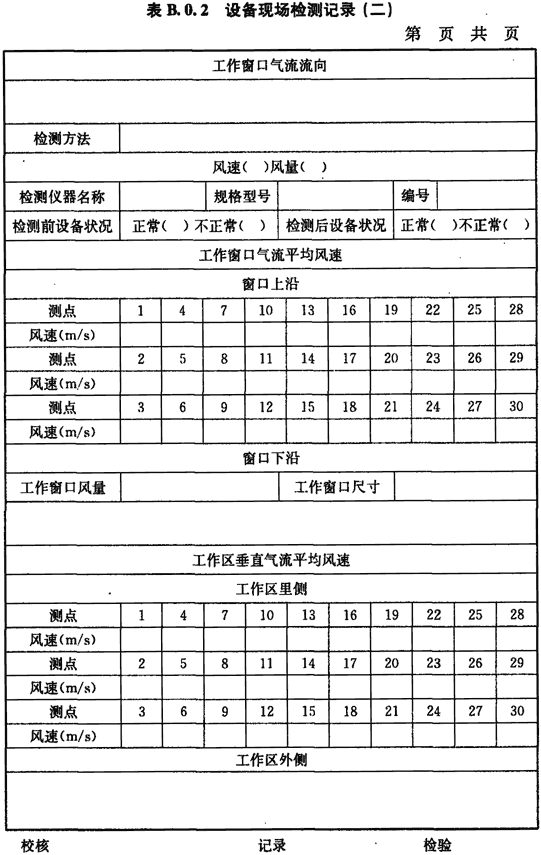 B.0.2 工作窗口氣流流向情況、風(fēng)速(或風(fēng)量)的檢測應按表B.0.2進(jìn)行記錄。