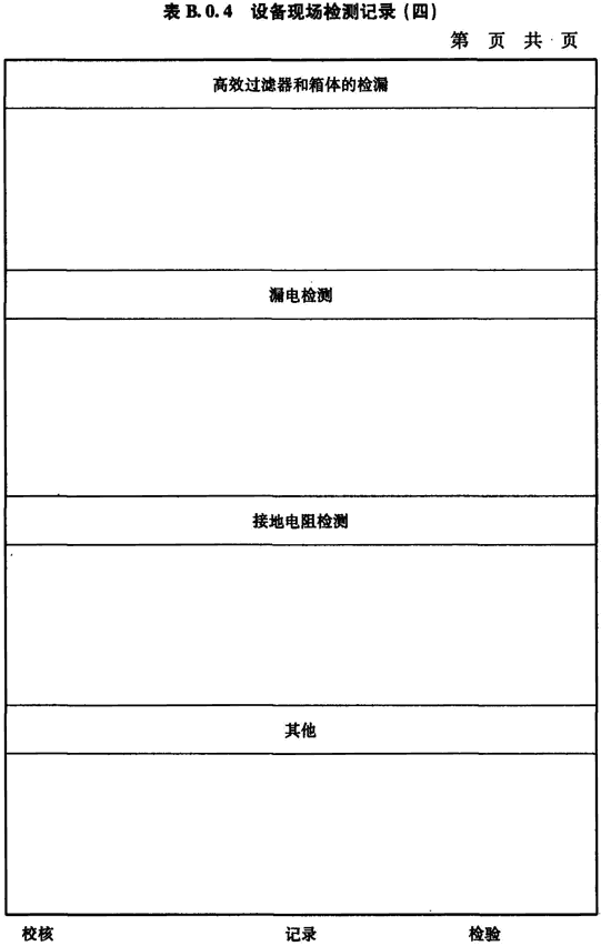 B.0.4 排風(fēng)高效過(guò)濾器的檢漏、生物安全柜箱體的檢漏、生物安全柜漏電檢測、接地電阻檢測等的檢測應按表B.0.4進(jìn)行記錄。