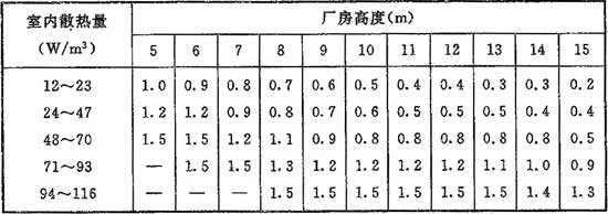 H.0.3 散熱量有效系數m值宜按相同建筑物和工藝布置的實(shí)測數據采用,當無(wú)實(shí)測數據時(shí),單跨生產(chǎn)廠(chǎng)房可按下式計算:
